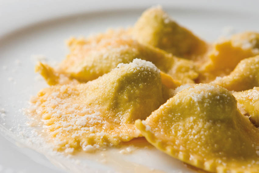 - Condire con burro fuso e doppio concentrato di pomodoro per rendere i tortelli leggermente di color rosa. Spolverare con parmigiano reggiano grattugiato.